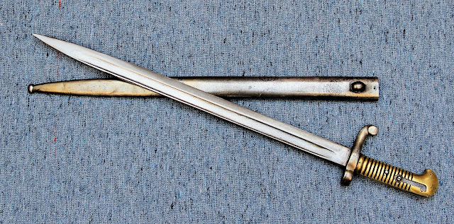 Si llama la atención la vaina que es igual a la de la bayoneta Rémington Modelo Argentino 1879 utilizada solo en nuestro país. En este caso mi ejemplar tiene en falta la boquilla de la vaina.